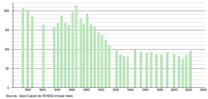 L'évolution du nombre d'habitants est connue à travers les recensements de la population effectués dans la commune depuis 1793. Pour les communes de moins de 10 000 habitants, une enquête de recensement portant sur toute la population est réalisée tous les cinq ans, les populations de référence des années intermédiaires étant quant à elles estimées par interpolation ou extrapolation[12]. Pour la commune, le premier recensement exhaustif entrant dans le cadre du nouveau dispositif a été réalisé en 2006[13].