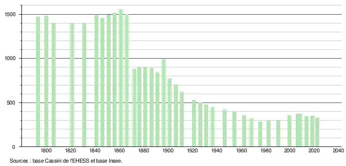 L'évolution du nombre d'habitants est connue à travers les recensements de la population effectués dans la commune depuis 1793. Pour les communes de moins de 10 000 habitants, une enquête de recensement portant sur toute la population est réalisée tous les cinq ans, les populations de référence des années intermédiaires étant quant à elles estimées par interpolation ou extrapolation[20]. Pour la commune, le premier recensement exhaustif entrant dans le cadre du nouveau dispositif a été réalisé en 2008[21].