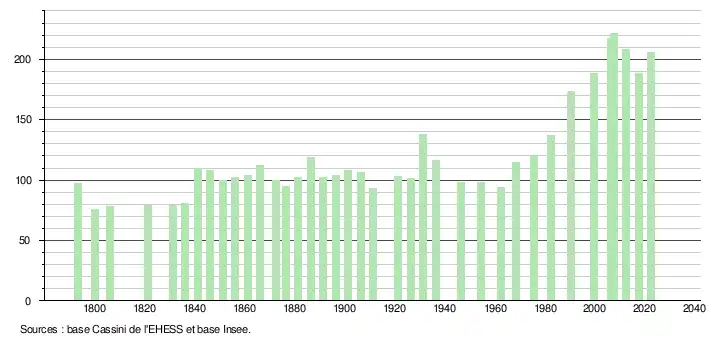 - ↑ Fiches Insee - Populations de référence de la commune pour les années 2006, 2007, 2008, 2009, 2010, 2011, 2012, 2013, 2014, 2015, 2016, 2017, 2018, 2019, 2020, 2021 et 2022.