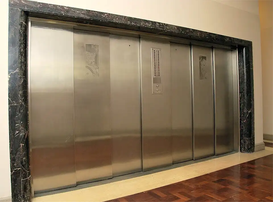 Garni de marbre noir, chaque ascenseur dispose de portes décorées distinctement par une représentation iconique animale et végétale (attribuées à Ivan Mitford-Barberton) voire par une représentation du logo de l'entreprise.