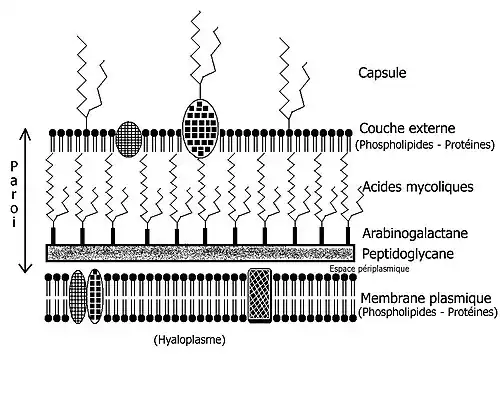 Le squelette de la paroi est composé de peptidoglycane (appelé aussi muréine) relié de façon covalente à un hétéroside : l'arabinogalactane, lui-même estérifié par des acides mycoliques, acides gras particuliers à très longue chaîne. Ils forment alors des cires.