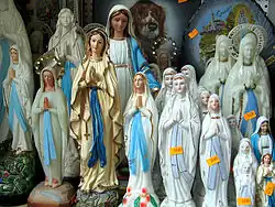 Enfin les apparitions de la Vierge en personne sont anciennes. À une époque indéterminée, la Vierge sauve une jeune fille de la noyade en lui tendant un rameau, origine du pèlerinage de Lestelle-Bétharram (Bèth arram signifie en gascon « beau rameau »). Elle se montre, en 1515, à Anglèze de Sagazan, une petite bergère de Monléon-Magnoac, sur le futur sanctuaire de Garaison. En 1587, elle apparaît à Médous à une femme de Bagnères-de-Bigorre, Domenge Liloye, pour annoncer une épidémie de peste punitive, et sauver les personnes qui boiront l'eau d'une source miraculeuse[23]. Ces saintes femmes ne connaîtront pas l'honneur d'une canonisation officielle. D'autres apparitions sont signalées de façon moins détaillée[24], mais il est fréquent de constater que Marie, là encore, succède à d'autres : les Damas blancas (Dames blanches), formes féminines diaphanes souvent notées à proximité de grottes ayant connu une occupation humaine aux époques préhistoriques. Le succès phénoménal de Lourdes — qui coïncide avec l'essor du chemin de fer — a éclipsé les autres pèlerinages, qui déplaçaient cependant de grandes foules. En 1859, une apparition mariale a encore lieu au village commingeois d'Arnaud-Guilhem, au nord de Saint-Gaudens.