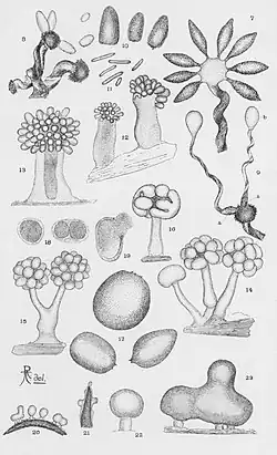 Lorsque les nutriments sont rares, les cellules de myxobactéries s'agrègent pour former des corps de fructification (à ne pas confondre avec ceux produits par les Fungi, les sporophores), un processus qu'on a longtemps pensé comme contrôlé par chimiotaxie mais désormais considéré comme une forme de signalisation cellulaire par contact[9],[10]. Ces corps de fructification peuvent prendre différentes formes et couleurs selon l'espèce. Au sein des corps de fructification, les cellules sont d'abord dans un état végétatif et en forme de bâtonnets, puis se développent en myxospores de forme ronde avec d'épaisses parois cellulaires. Ces myxospores, analogues aux spores que l'on retrouve chez d'autres organismes, auront une meilleure chance de survie jusqu'à ce que les nutriments soient de nouveau abondants dans l'environnement. On pense que le processus de fructification favorise les myxobactéries en assurant que la croissance cellulaire soit reprise au niveau d'un groupe de myxobactéries (essaim ou swarm en anglais), plutôt qu'au niveau de cellules isolées. Des cycles de vie similaires se sont développés chez les myxomycètes.