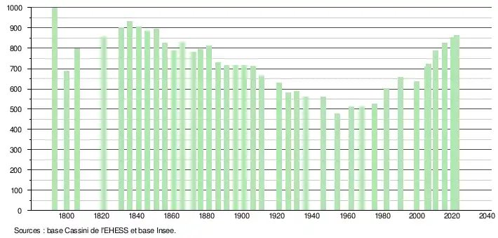 L'évolution du nombre d'habitants est connue à travers les recensements de la population effectués dans la commune depuis 1793. Pour les communes de moins de 10 000 habitants, une enquête de recensement portant sur toute la population est réalisée tous les cinq ans, les populations de référence des années intermédiaires étant quant à elles estimées par interpolation ou extrapolation[25]. Pour la commune, le premier recensement exhaustif entrant dans le cadre du nouveau dispositif a été réalisé en 2005[26].