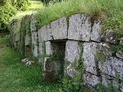 La tombe était fermée par une grosse plaque en tuf à l'intérieur et par un mur de blocs de tuf à l'extérieur, alignés avec les parois de la tombe. Entre la plaque et le mur, le remplissage était de terre battue. Devant la porte étaient déposées des cippes, dont la forme se rapportait au genre du mort :