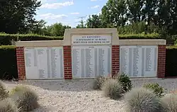 Croix en pierre portant les noms de 5 victimes civiles belges et françaises.