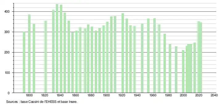 - ↑ Fiches Insee - Populations de référence de la commune pour les années 2006, 2007, 2008, 2009, 2010, 2011, 2012, 2013, 2014, 2015, 2016, 2017, 2018, 2019, 2020, 2021 et 2022.