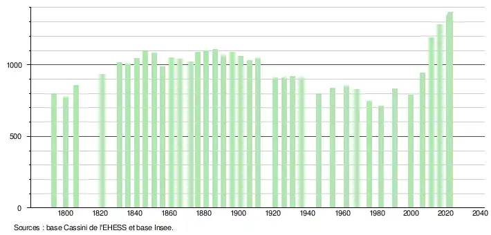 L'évolution du nombre d'habitants est connue à travers les recensements de la population effectués dans la commune depuis 1793. Pour les communes de moins de 10 000 habitants, une enquête de recensement portant sur toute la population est réalisée tous les cinq ans, les populations de référence des années intermédiaires étant quant à elles estimées par interpolation ou extrapolation[33]. Pour la commune, le premier recensement exhaustif entrant dans le cadre du nouveau dispositif a été réalisé en 2006[34].