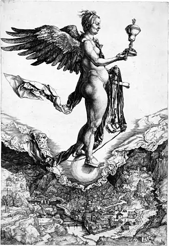 Dürer représente une figure féminine puissante, nue et ailée, dressée sur une sphère flottant au milieu des cieux, à moins que ce ne soit le vide, et tenant d'une main le symbole de la récompense, un gobelet orfévré, et de l'autre celui du châtiment, des brides. La déesse présente une nudité corpulente, au réalisme plastique non idéalisé[1].