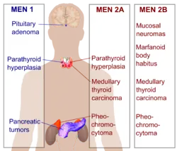 La néoplasie endocrinienne multiple de type 2 est la forme héréditaire du cancer médullaire de la thyroïde. Il existe trois sous types en fonction de l'association des cancers endocriniens