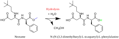 Le néotame s'hydrolyse lentement dans les milieux aqueux, résultant principalement de la formation d’une quantité équimolaire de N-[N-(3,3-diméthylbutyle)-L-α-aspartyl]-L-phénylalanine et de méthanol. Trois autres produits de dégradation sont aussi présents mais ils ne sont pas détectés aux concentrations d'utilisation de l'édulcorant. Par cyclisation se forme le N-[N-(3,3-diméthylbutyle)-L-aspartamidyl]-L-phénylalanine 1-ester méthylique, qui ensuite donne le N-[N-(3,3-diméthylbutyle)-L-aspartamidyl]-L-phénylalanine par hydrolyse, et enfin le N-[N-(3,3-diméthylbutyle)-L-β-aspartyl]-L-phénylalanine 1-ester méthylique qui se forme par réarrangement β du néotame[6].
