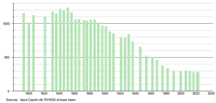 L'évolution du nombre d'habitants est connue à travers les recensements de la population effectués dans la commune depuis 1793. Pour les communes de moins de 10 000 habitants, une enquête de recensement portant sur toute la population est réalisée tous les cinq ans, les populations de référence des années intermédiaires étant quant à elles estimées par interpolation ou extrapolation[21]. Pour la commune, le premier recensement exhaustif entrant dans le cadre du nouveau dispositif a été réalisé en 2006[22].