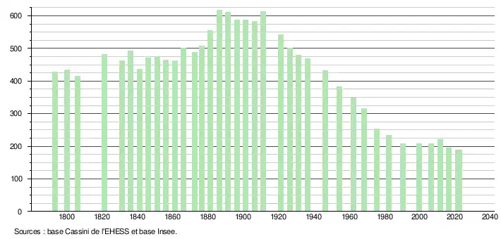 L'évolution du nombre d'habitants est connue à travers les recensements de la population effectués dans la commune depuis 1793. Pour les communes de moins de 10 000 habitants, une enquête de recensement portant sur toute la population est réalisée tous les cinq ans, les populations de référence des années intermédiaires étant quant à elles estimées par interpolation ou extrapolation[30]. Pour la commune, le premier recensement exhaustif entrant dans le cadre du nouveau dispositif a été réalisé en 2006[31].