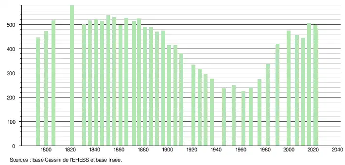 L'évolution du nombre d'habitants est connue à travers les recensements de la population effectués dans la commune depuis 1793. Pour les communes de moins de 10 000 habitants, une enquête de recensement portant sur toute la population est réalisée tous les cinq ans, les populations de référence des années intermédiaires étant quant à elles estimées par interpolation ou extrapolation[23]. Pour la commune, le premier recensement exhaustif entrant dans le cadre du nouveau dispositif a été réalisé en 2006[24].