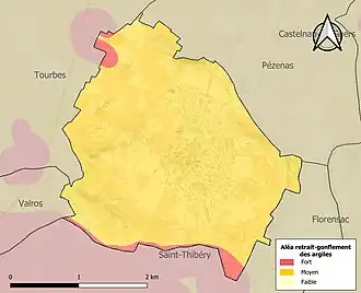Le retrait-gonflement des sols argileux est susceptible d'engendrer des dommages importants aux bâtiments en cas d’alternance de périodes de sécheresse et de pluie. La totalité de la commune est en aléa moyen ou fort (59,3 % au niveau départemental et 48,5 % au niveau national). Sur les 835 bâtiments dénombrés sur la commune en 2019, 835 sont en aléa moyen ou fort, soit 100 %, à comparer aux 85 % au niveau départemental et 54 % au niveau national. Une cartographie de l'exposition du territoire national au retrait gonflement des sols argileux est disponible sur le site du BRGM[16],[Carte 2].