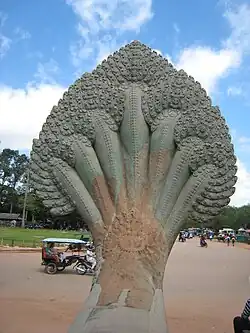 On trouve des légendes à propos du nāga ou serpent dans les mythologies hindoue et bouddhiste. Sa fréquence dans l'art khmer est extraordinaire. Le royaume des nāgas est constitué par les rivières, les lacs et les mers et c'est là que ces créatures royales demeurent dans des palais luxueux, décorés de perles et de pierres précieuses. Le nāga n'est pas seulement le gardien de l'énergie vitale des eaux, mais également celui des coraux, des coquillages et des perles. Il porte un joyau sur la tête. Les formes sinueuses du nāga créent des arches autour des frontons, des balustrades autour des bassins et des chaussées. Ces chaussées sont souvent appelées « ponts de nāgas », mais dans tous ces cas, le corps allongé du nāga symbolise l'arc-en-ciel qui relie le monde divin au monde humain.