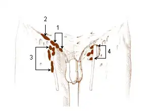 - ↑ (en) Y. Zhu, S. L. Zhang, D. W. Ye et al., « Prospectively packaged ilioinguinal lymphadenectomy for penile cancer: the disseminative pattern of lymph node metastasis », J. Urol., vol. 181, no 5, , p. 2103–8 (PMID 19286211, DOI 10.1016/j.juro.2009.01.041, lire en ligne)