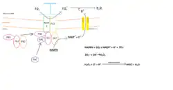 La NADPH oxydase est composée de six sous-unités se regroupant pour former le complexe enzymatique au niveau de la membrane plasmique du phagolysosome. Cette association permet l'oxydation du NADPH en NADP+, ce qui aboutit à la synthèse de ROS[5].