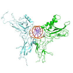 NF-κB s'associe avec RelB (cyan) pour former un complexe avec l'ADN (orange), enclenchant ainsi la stimulation de la transcription d'un gène.