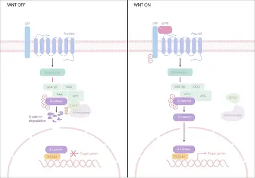 Les voies de signalisation de Wnt englobent les voies Wnt/β-caténine, Wnt/planner cell polarity et Wnt/Ca2+. La voie de signalisation Wnt/β-caténine est une classe de signalisation Wnt dépendante de la β-caténine, également connue sous le nom de voie canonique, qui contrôle principalement la prolifération cellulaire. Les voies Wnt/PCP et Wnt/Ca2+ ne dépendent pas de la β-caténine et sont connues comme voies non canoniques qui régulent la polarité, l’adhésion et la migration cellulaire. Dans la voie Wnt/β-caténine, les protéines liées aux récepteurs des lipoprotéines et la famille des protéines frizzled agissent comme des récepteurs Wnt et forment un complexe avec les protéines Wnt pour activer la signalisation en aval.
