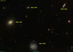 NGC 1052 est une galaxie elliptique située dans la constellation de la Baleine. Sa vitesse par rapport au fond diffus cosmologique est de 1 271 ± 16 km/s ce qui correspond à une distance de Hubble de 18,8 ± 1,3 Mpc (∼61,3 millions d'al)[1]. NGC 1052 a été découverte par l'astronome germano-britannique William Herschel en 1785[3].