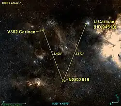 NGC 3519 est situé à environ 2,4 degrés au sud-ouest de V382 Carinae et à environ 2,7 au sud-est de u Carinae.
