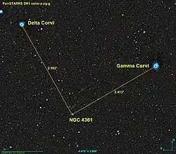 La nébuleuse NGC 4361 est située à environ 2,6 degrés au sud-ouest de Delta Corvi (Algorab) et à environ 2,4 degrés au sud-est de Gamma Corvi(Gienah).