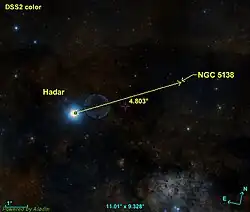 NGC 5138 est situé à environ 4,8 degrés au nord-ouest d'Hadar Beta Centauri.