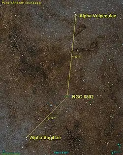 NGC 6802 est à environ 3,1° au nord-ouest de l'étoile Alpha Sagittae et à 4,4° au sud-est de l'étoile Alpha Vulpeculae.