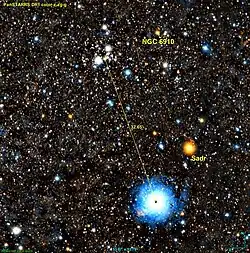 NGC 6910 est assez rapproché de l'étoile Gamma Cygni à seulement 33'.