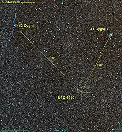 NGC 6940 est situé tout près de la frontière séparant les constellations du Petit Renard et du Cygne. Les deux étoiles brillantes les plus rapprochées sont dans le Cygne. Il s'agit de 41 Cygni et de 52 Cygni respectivement à environ 2,3 degrés au nord-ouest et 3,4 degrés au nord-est de l'amas[8].