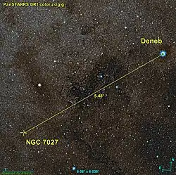 La nébuleuse NGC 7027 est située à environ 5,5 degrés au sud-est de Deneb.