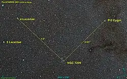 NGC 7209 est situé à environ 4,4 degré au sud-ouest de l'étoile 4 Lacertae et à environ 4,1 degrés au sud-est de Pi2 Cygni.