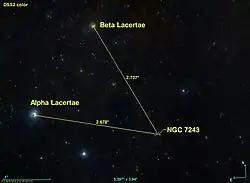 NGC 7243 est situé à environ 2,7 degrés au sud-ouest de l'étoile Alpha Lacertae et à environ 2,7 degrés au sud-ouest de l'étoile Beta Lacertae.