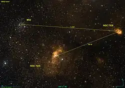 NGC 7635 ou Sh2-162 ou LBN 549 ou Caldwell 11 ou nébuleuse de la Bulle[7] est une nébuleuse en émission (région HII) et une bulle de vent stellaire d'environ 8 000 années-lumière (al) de diamètre, située à environ 7 000 al de la Terre, dans la constellation de Cassiopée du bras de Persée de la Voie lactée.