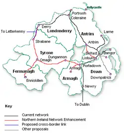 • L'amélioration de l'infrastructure sur le trajet Belfast-Derry, ou au minimum la mise en place de voies d'évitement, afin de permettre une fréquence de trains plus élevée et une vitesse augmentée.