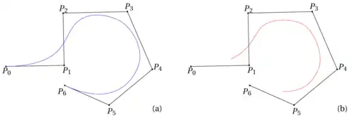 Par exemple, le premier et le dernier point du polygone de contrôle sont par convention multiples. Les premiers nœuds sont nuls et les derniers nœuds sont égaux à 1, i.e. . Ceci oblige alors la courbe à passer par le premier ainsi que par le dernier point du polygone de contrôle.