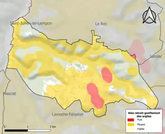 Le retrait-gonflement des sols argileux est susceptible d'engendrer des dommages importants aux bâtiments en cas d’alternance de périodes de sécheresse et de pluie. 71,9 % de la superficie communale est en aléa moyen ou fort (67,7 % au niveau départemental et 48,5 % au niveau national). Sur les 142 bâtiments dénombrés sur la commune en 2019, 119 sont en aléa moyen ou fort, soit 84 %, à comparer aux 72 % au niveau départemental et 54 % au niveau national. Une cartographie de l'exposition du territoire national au retrait gonflement des sols argileux est disponible sur le site du BRGM[20],[Carte 2].