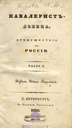Nadejda Andreïevna Dourova est une femme de lettres et un officier russe née le 17 septembre 1783 ( dans le calendrier grégorien) à Kiev et morte le 21 mars 1866 ( dans le calendrier grégorien) à Ielabouga. Elle est la première femme officier de la cavalerie russe et l'auteur d'une des premières autobiographies en russe.