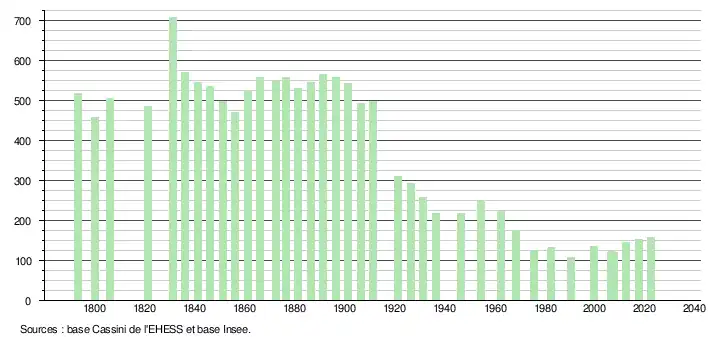 L'évolution du nombre d'habitants est connue à travers les recensements de la population effectués dans la commune depuis 1793. Pour les communes de moins de 10 000 habitants, une enquête de recensement portant sur toute la population est réalisée tous les cinq ans, les populations de référence des années intermédiaires étant quant à elles estimées par interpolation ou extrapolation[19]. Pour la commune, le premier recensement exhaustif entrant dans le cadre du nouveau dispositif a été réalisé en 2007[20].