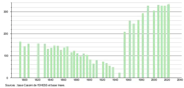 L'évolution du nombre d'habitants est connue à travers les recensements de la population effectués dans la commune depuis 1793. Pour les communes de moins de 10 000 habitants, une enquête de recensement portant sur toute la population est réalisée tous les cinq ans, les populations de référence des années intermédiaires étant quant à elles estimées par interpolation ou extrapolation[22]. Pour la commune, le premier recensement exhaustif entrant dans le cadre du nouveau dispositif a été réalisé en 2006[23].
