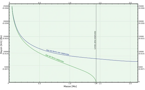 L'existence d'une masse limite, qu'aucune naine blanche ne peut excéder, est une conséquence de l'équilibre entre la gravitation et la pression de dégénérescence des électrons. Cette masse a été publiée initialement en 1929 par Wilhelm Anderson[89] et en 1930 par Edmund C. Stoner[90]. La valeur moderne de la limite fut d'abord publiée en 1931 par Subrahmanyan Chandrasekhar dans son article « The Maximum Mass of Ideal White Dwarfs[91] ». Pour une naine blanche qui n'est pas en rotation, elle est approximativement égale à 5,7/μe² M, où μe est la masse moléculaire moyenne par électron de l'étoile[92]. Comme le carbone 12 et l'oxygène 16, prédominants dans la composition d'une naine blanche à carbone-oxygène, ont tous deux un numéro atomique de moitié égal à leur masse atomique, on peut prendre 2 comme valeur de μe pour une telle étoile[87], ce qui conduit à la valeur généralement citée de 1,4 M. (Vers le début du XXe siècle, il existait de bonnes raisons de penser que les étoiles étaient principalement composées d'éléments lourds[90], aussi dans son article de 1931, Chandrasekhar prit la masse moléculaire moyenne par électron μe égale à 2,5, donnant en conséquence une limite de 0,91 M). En 1983, avec William Alfred Fowler, Chandrasekhar reçut le Prix Nobel de physique « [pour] ses études théoriques des processus physiques importants pour la structure et l'évolution des étoiles ». La masse limite est maintenant appelée la « masse de Chandrasekhar ».