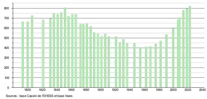 L'évolution du nombre d'habitants est connue à travers les recensements de la population effectués dans la commune depuis 1793. Pour les communes de moins de 10 000 habitants, une enquête de recensement portant sur toute la population est réalisée tous les cinq ans, les populations de référence des années intermédiaires étant quant à elles estimées par interpolation ou extrapolation[17]. Pour la commune, le premier recensement exhaustif entrant dans le cadre du nouveau dispositif a été réalisé en 2008[18].