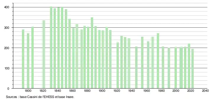 L'évolution du nombre d'habitants est connue à travers les recensements de la population effectués dans la commune depuis 1793. Pour les communes de moins de 10 000 habitants, une enquête de recensement portant sur toute la population est réalisée tous les cinq ans, les populations de référence des années intermédiaires étant quant à elles estimées par interpolation ou extrapolation[20]. Pour la commune, le premier recensement exhaustif entrant dans le cadre du nouveau dispositif a été réalisé en 2007[21].
