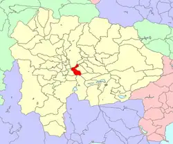 Entités territoriales limitrophes à la date de la fusion du [4],[3]. À sa création le , Nakamichi est entouré à partir de l'ouest, dans le sens horaire, du village de Toyotomi (豊富村), du même district de Higashiyatsushiro, par un quadripoint, du village de Tamaho (玉穂町), du district de Nakakoma, de la ville de Kōfu (甲府市), des villages de Fujimi (ja) (富士見村), Sakaigawa (境川村) et Ashigawa (芦川村), du même district de Higashiyatsushiro, et du village de Kamikuishiki (ja) (上九一色村) et du bourg de Mitama (三珠町), tous deux du district de Nishiyatsushiro[4]. Le , Fujimi est absorbé par le bourg d'Isawa (石和町), qui devient voisin de Nakamichi[4]. Le , Isawa, Sakaigawa et quatre autres municipalités fusionnent pour former la ville de Fuefuki (笛吹市)[4]. Le , Mitama fusionne avec les bourgs d'Ichikawadaimon (市川大門町) et de Rokugō (六郷町) pour former le bourg d'Ichikawamisato (市川三郷町)[4]. Le , Toyotomi, Tamaho et le bourg de Tatomi (田富町) fusionnent pour former la ville de Chūō (中央市)[4].