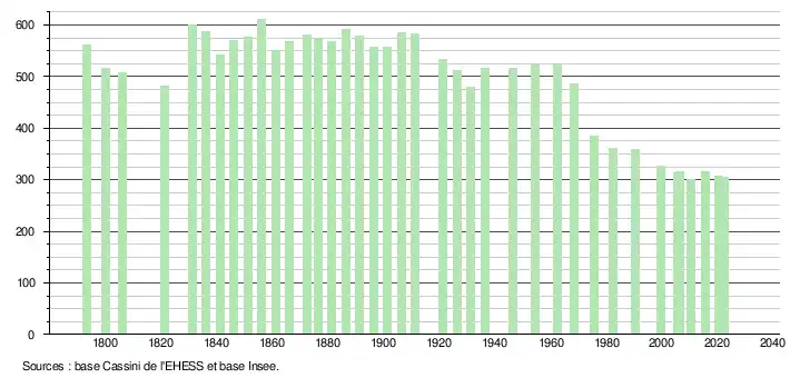 L'évolution du nombre d'habitants est connue à travers les recensements de la population effectués dans la commune depuis 1793. Pour les communes de moins de 10 000 habitants, une enquête de recensement portant sur toute la population est réalisée tous les cinq ans, les populations de référence des années intermédiaires étant quant à elles estimées par interpolation ou extrapolation[20]. Pour la commune, le premier recensement exhaustif entrant dans le cadre du nouveau dispositif a été réalisé en 2005[21].