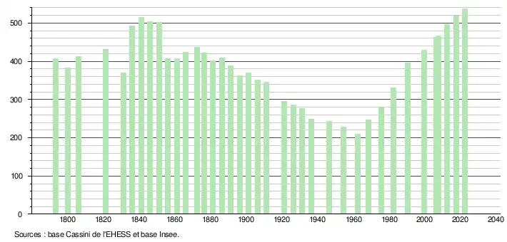 L'évolution du nombre d'habitants est connue à travers les recensements de la population effectués dans la commune depuis 1793. Pour les communes de moins de 10 000 habitants, une enquête de recensement portant sur toute la population est réalisée tous les cinq ans, les populations de référence des années intermédiaires étant quant à elles estimées par interpolation ou extrapolation[19]. Pour la commune, le premier recensement exhaustif entrant dans le cadre du nouveau dispositif a été réalisé en 2007[20].