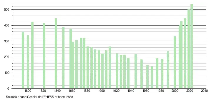 L'évolution du nombre d'habitants est connue à travers les recensements de la population effectués dans la commune depuis 1793. Pour les communes de moins de 10 000 habitants, une enquête de recensement portant sur toute la population est réalisée tous les cinq ans, les populations de référence des années intermédiaires étant quant à elles estimées par interpolation ou extrapolation[26]. Pour la commune, le premier recensement exhaustif entrant dans le cadre du nouveau dispositif a été réalisé en 2008[27].