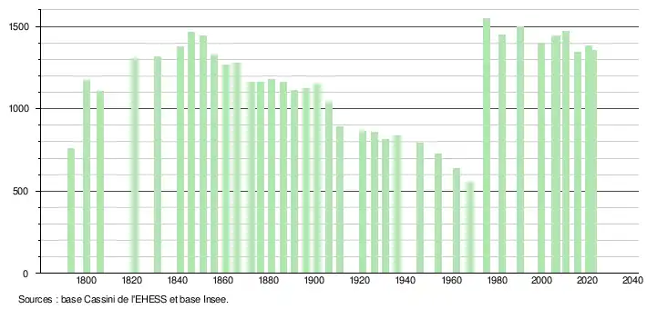 L'évolution du nombre d'habitants est connue à travers les recensements de la population effectués dans la commune depuis 1793. Pour les communes de moins de 10 000 habitants, une enquête de recensement portant sur toute la population est réalisée tous les cinq ans, les populations de référence des années intermédiaires étant quant à elles estimées par interpolation ou extrapolation[29]. Pour la commune, le premier recensement exhaustif entrant dans le cadre du nouveau dispositif a été réalisé en 2005[30].