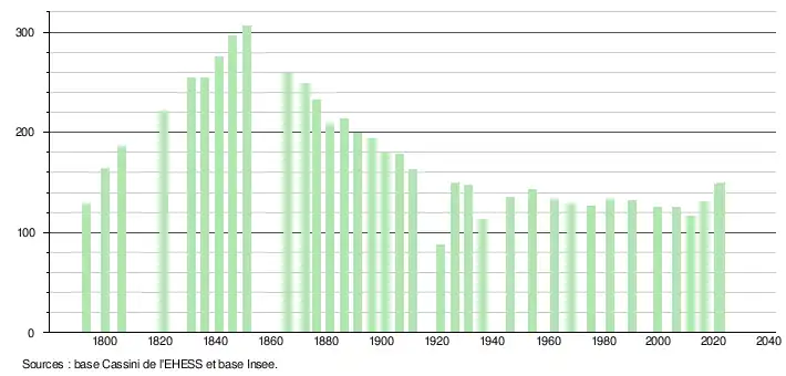 L'évolution du nombre d'habitants est connue à travers les recensements de la population effectués dans la commune depuis 1793. Pour les communes de moins de 10 000 habitants, une enquête de recensement portant sur toute la population est réalisée tous les cinq ans, les populations de référence des années intermédiaires étant quant à elles estimées par interpolation ou extrapolation[21]. Pour la commune, le premier recensement exhaustif entrant dans le cadre du nouveau dispositif a été réalisé en 2006[22].